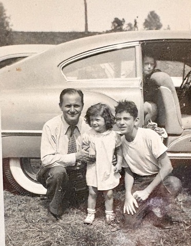 My dad died when I was ten. I adored him. He made me feel like the smartest, sassiest kid in the world. In the photo above, I believe we're heading home from a summer drive to the country, perhaps stopping for hot dogs or ice cream. Dad is spiffy in a shirt and tie, jacketless casual, and the three children, scruffier. My sister, nine years older than me, peeks out from the backseat, while my brother, eleven years older, is on the ground with Dad and me. My mother is behind the camera insisting on a picture that none of us want. We look hot, irritated, ready to get this over with. I imagine my sister yelling, "Let's go already!"